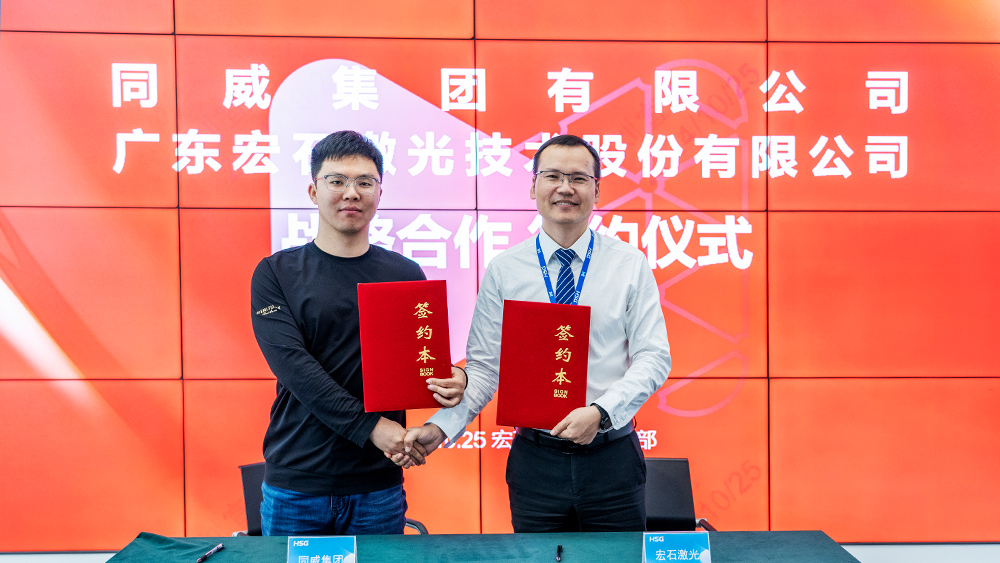 2024年10月25日,宏山激光與同威集團有限公司在佛山總部基地隆重舉行戰略合作協議簽署儀式。同威集團董事長安鵬飛與宏山激光業務副總裁張洪濤率領的團隊共同見證戰略協議簽署,雙方圍繞合作內容展開了深入交流。會談中,同威集團介紹了其在裝備制造領域的市場布局、技術研發成果及未來發展規劃,全面展現了其在行業中的核心競爭力。宏山激光則詳細闡述了在激光智能裝備領域的技術創新、產品優勢以及未來發展戰略。雙方一致認為,基于各自領域的技術優勢和資源互補,深化合作將為激光裝備行業帶來更多創新動力,同時為制造業的智能化轉型和高質量發展注入新的活力。此次戰略合作的達成標志著雙方將攜手邁向共贏新局面,共同推動行業升級與技術進步。